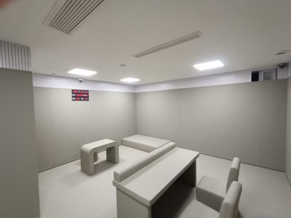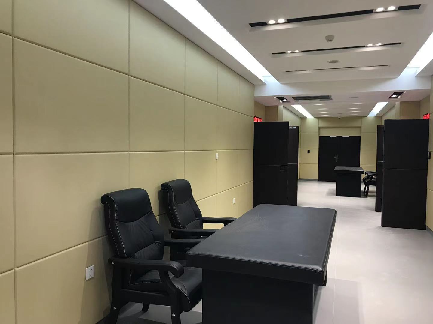 3、審問(wèn)室防撞軟包裝飾美:審問(wèn)室防撞軟包通過(guò)特硬處理,使四邊視點(diǎn)一致,拼合美感十分明顯,以往海綿及其它軟包無(wú)法做到的作用。并可依據(jù)聲學(xué)裝飾或業(yè)主的要求,調(diào)整飾面布、框的原料,美觀大方。