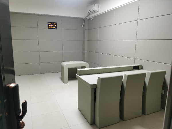審訊室面積為15-30平方,一般設置2臺全景攝像頭及1臺特寫攝像頭,1臺在線視頻系統(tǒng),通過聯(lián)網(wǎng)服務器進行遠程指揮及同步錄音攝像,房間內(nèi)配備示證視頻系統(tǒng)。配備辦公和談話桌椅,辦公和審訊桌椅均采用軟質(zhì)包覆,無安全隱患,配備多媒體排口系統(tǒng),方便辦公人員的電器設備,及視頻系統(tǒng)。 為進一步防止被審訊人的人身安全,以頭撞墻產(chǎn)生以外,墻面應用厚度大于2cm阻燃防撞軟體材料進行覆蓋,絕對不允許意外事件的發(fā)生。室內(nèi)電器設備安裝不規(guī)范有可能導致意外事件的發(fā)生。因此室內(nèi)所有的電器設備的電源插座,開關都建議采用集中控制的方式,由電腦控制開關,手動控制器和集線箱應安裝在過道或監(jiān)控房內(nèi)。為防止意外事件的發(fā)生,不建議使用公共衛(wèi)生間給被談話人使用。所以每間房間必須有獨立的衛(wèi)生間,所有馬桶及洗手盆必須軟包處理,并安裝隱蔽攝像頭。